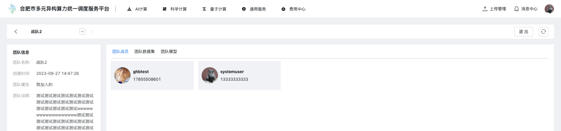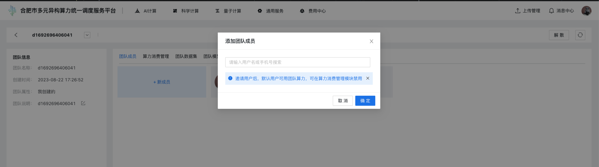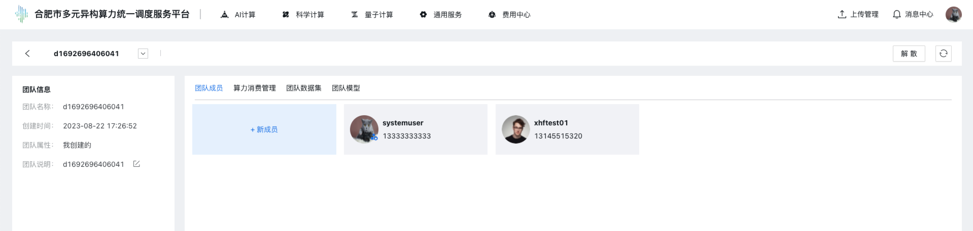 步骤3 点击操作栏中的“查看”按钮,跳转至团队详情页面,如果是团队创建者,展示团队成员、算力消费管理、团队数据集和团队模型四个tab标签,其中团队成员中展示“+新成员”按钮,如果是团队成员,则展示团队成员、团队数据集和团队模型三个tab标签,其中团队成员中没有“+新成员”按钮。