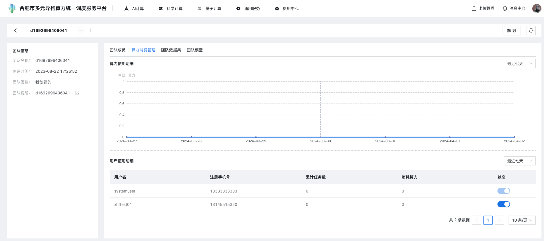 步骤5 如果是团队创建者,点击“算力消费管理”tab标签,可以通过右上角下拉选选择最近七天、最近30天、最近一年和全部时间,查看对应时间内的算力使用明细和用户使用明细,算力使用明细通过折线图展示,用户使用明细通过列表展示,列表项为:用户名、注册手机号、累计任务数、消耗算力和状态。