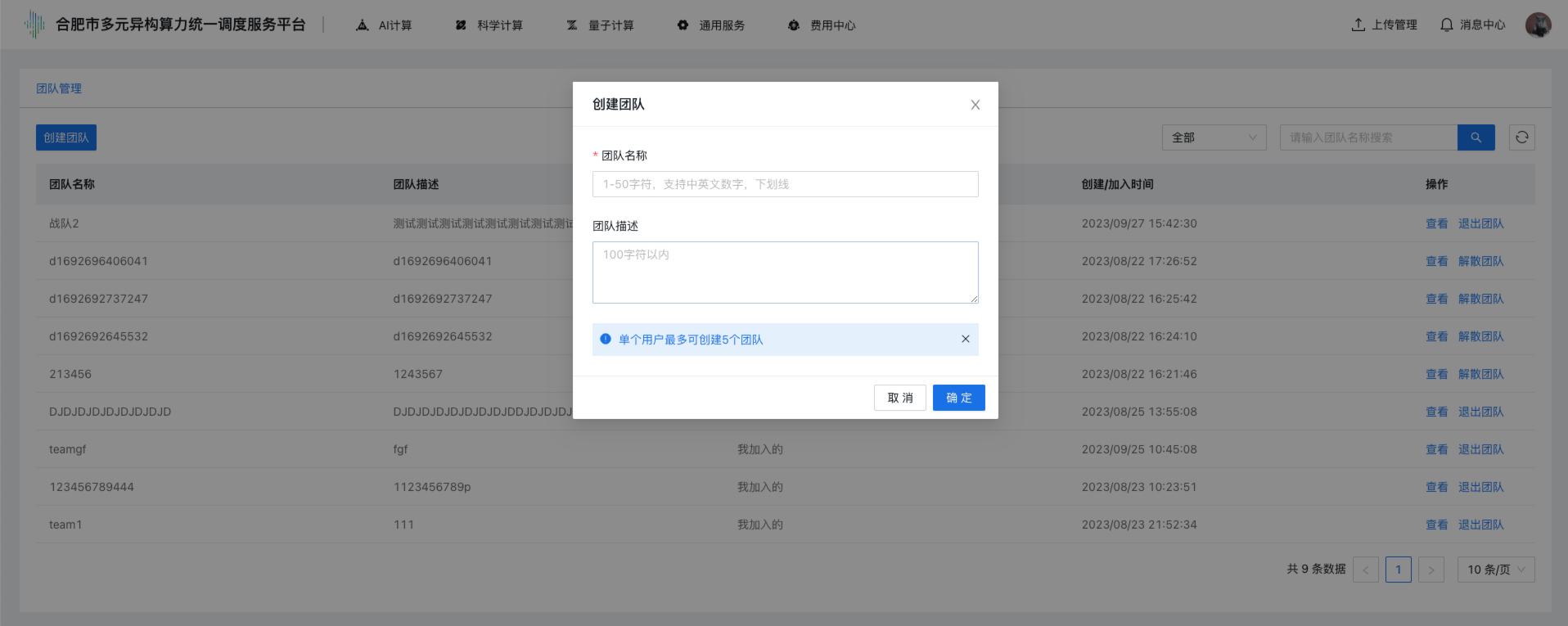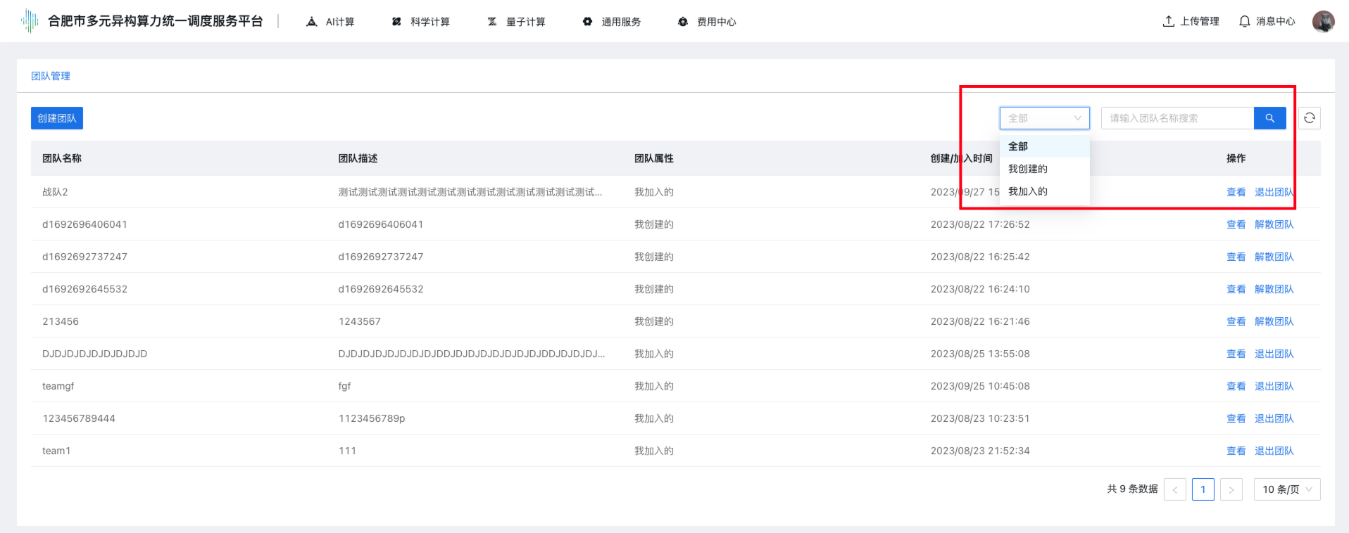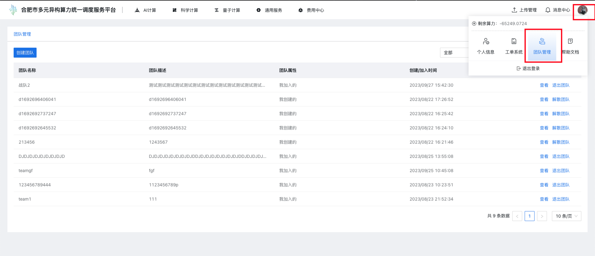 步骤2 单击“头像 → 团队管理”,进入团队管理控制台,控制台展示团队列表,列表展示:团队名称、团队描述、团队属性、创建/加入时间、操作(查看、解散团队/退出团队)。
