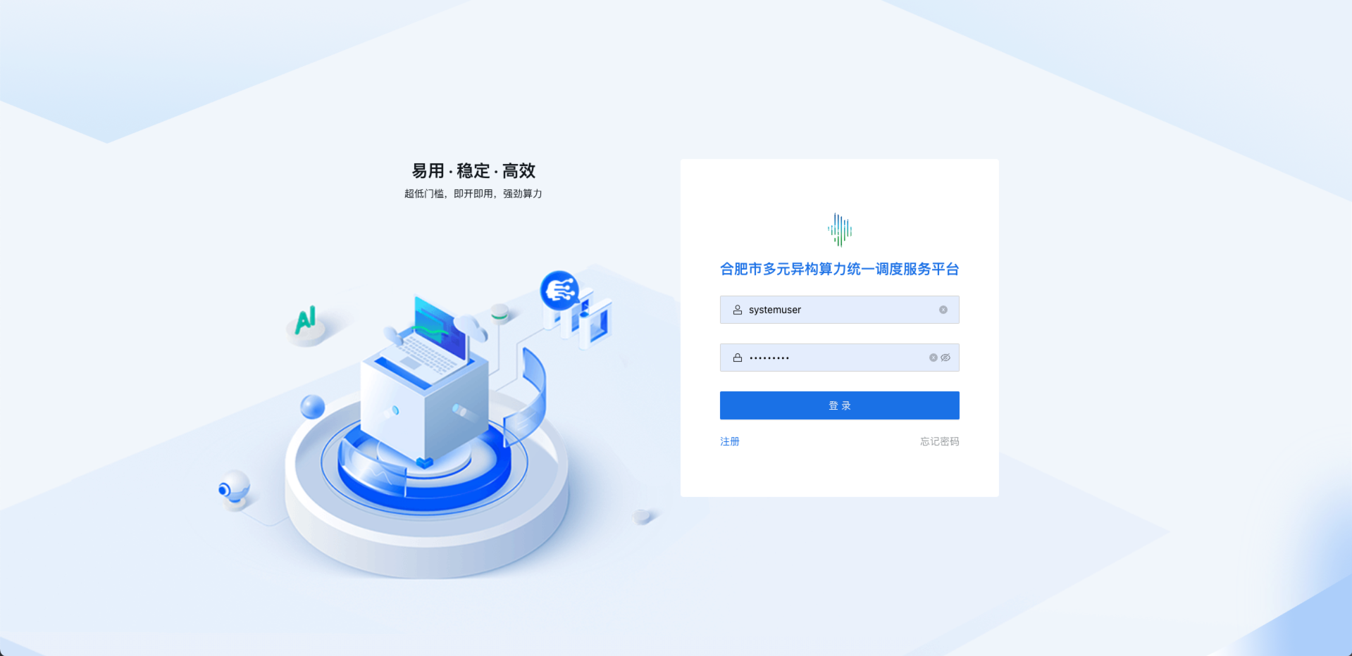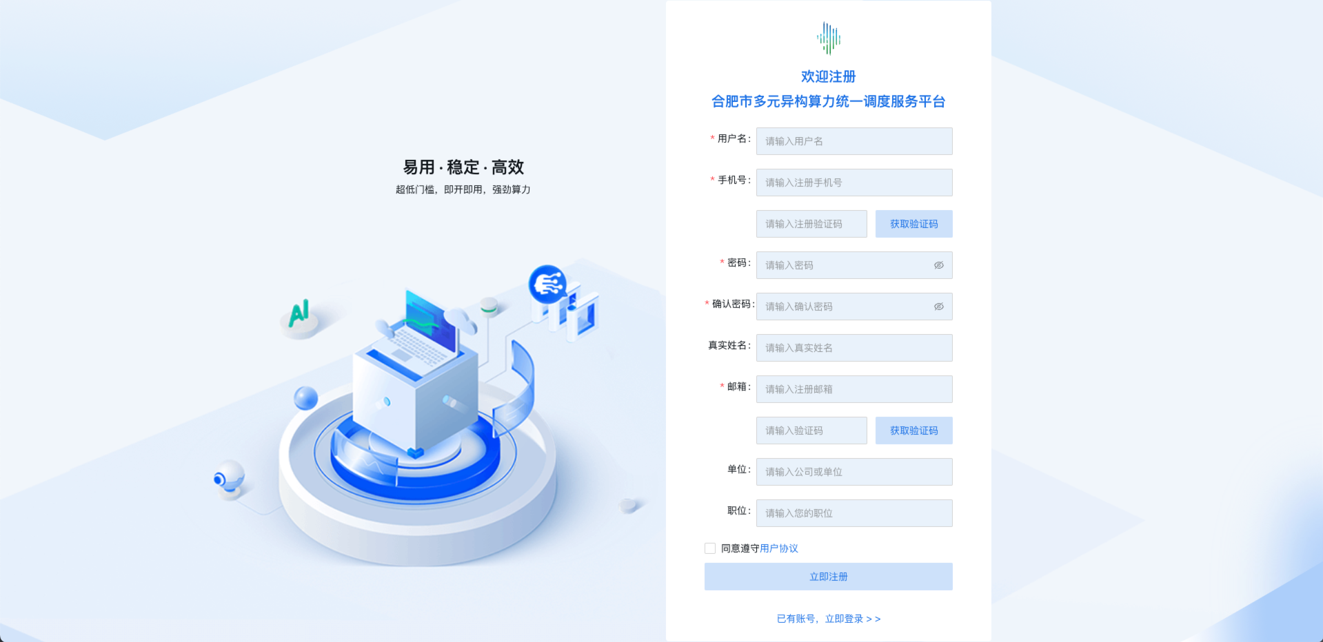 注册完成后,你将获得一个可登录平台的账号,您可以使用您的账号登入合肥市多元异构算力统一调度服务平台。