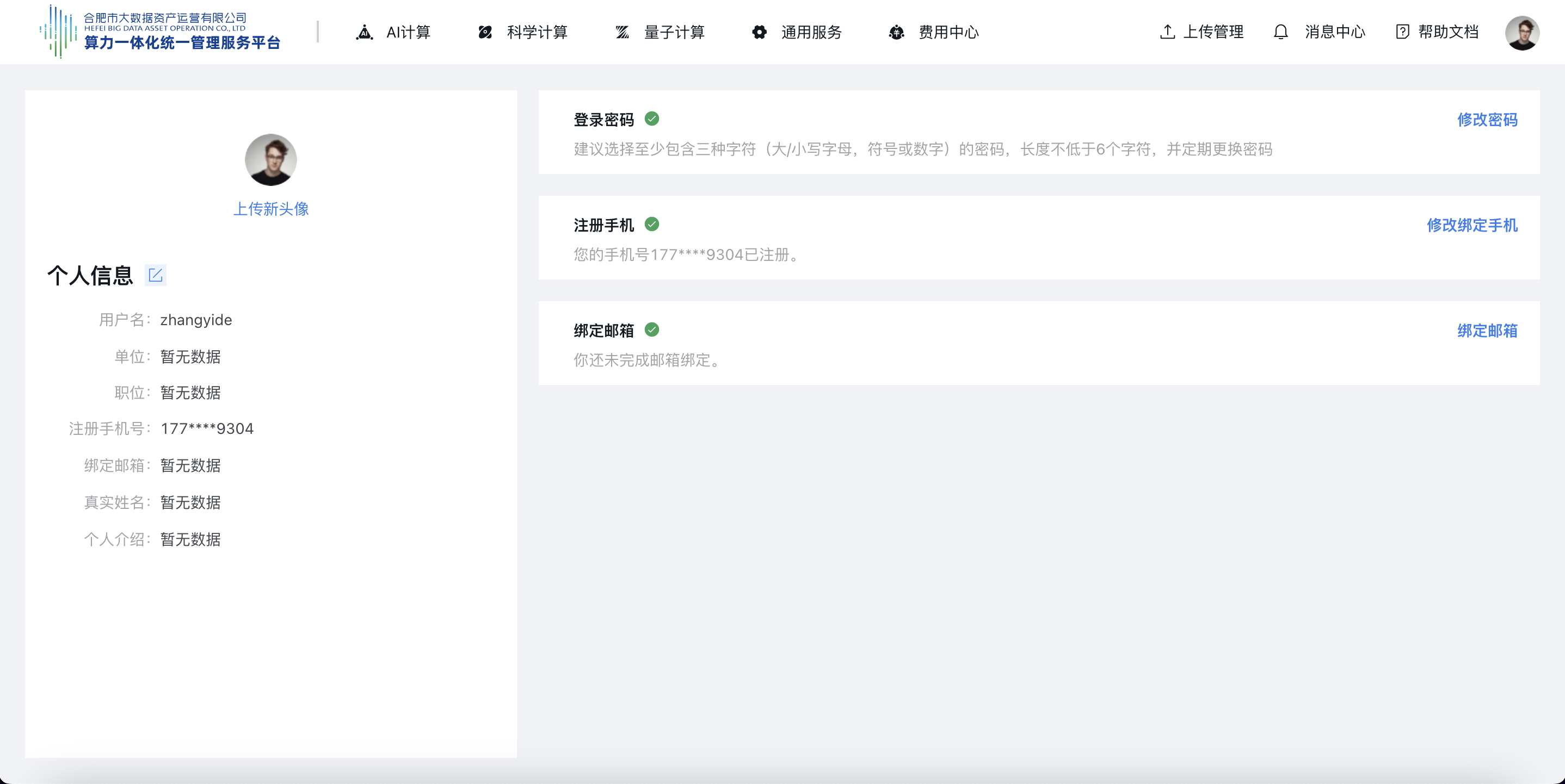 登录合肥市多元异构算力统一调度服务平台后,用户可点击“头像→个人信息”按钮,查看和维护用户的个人信息。