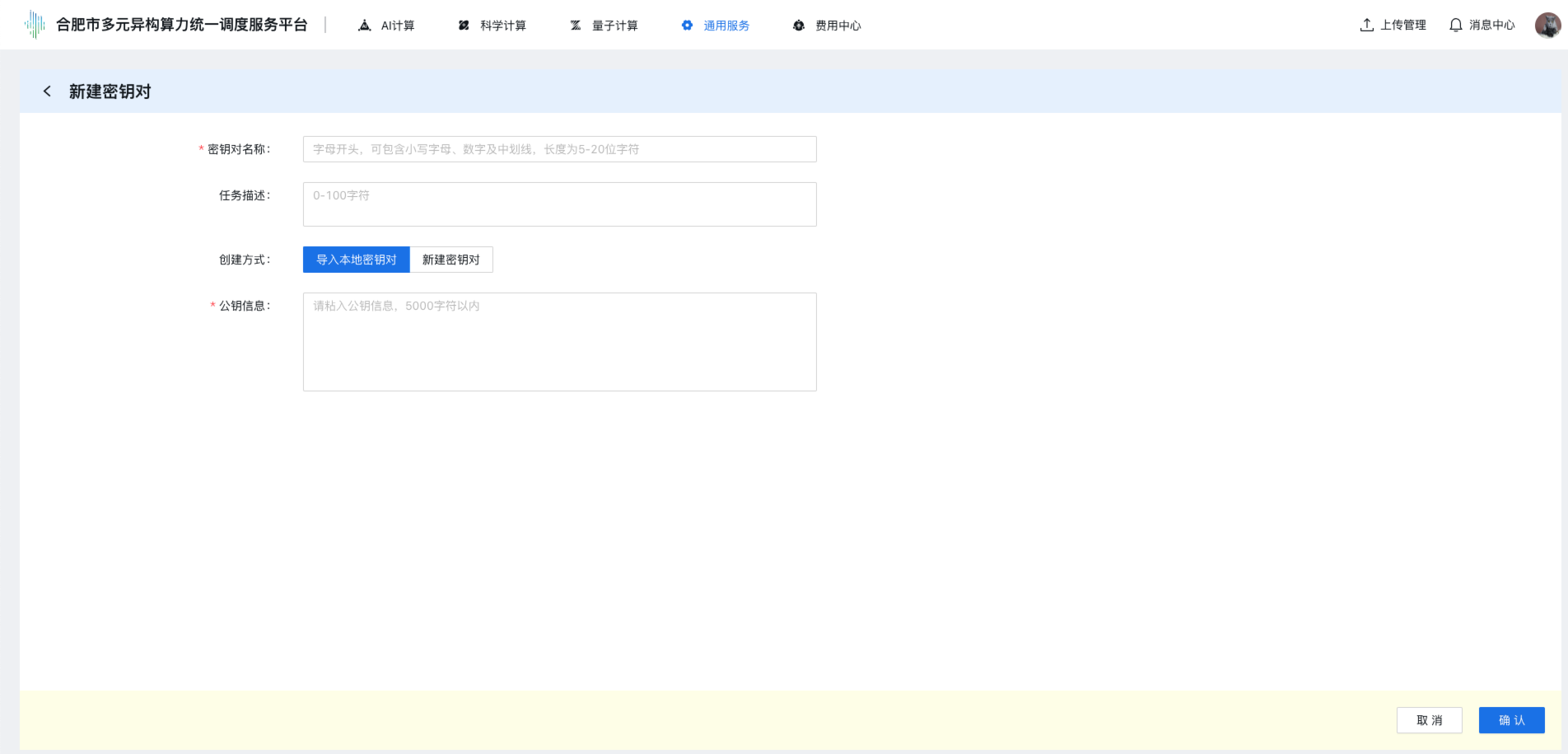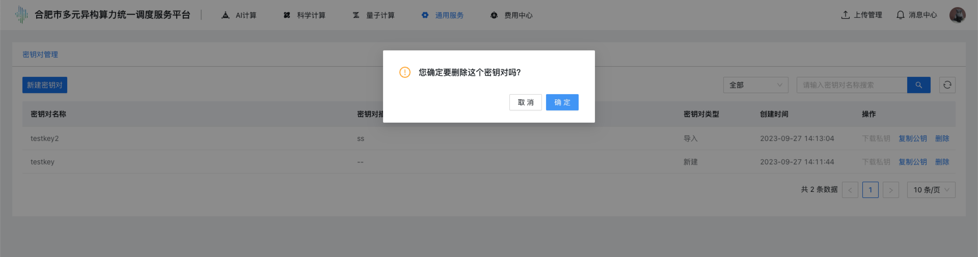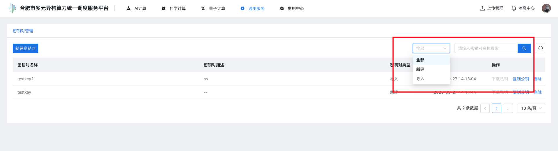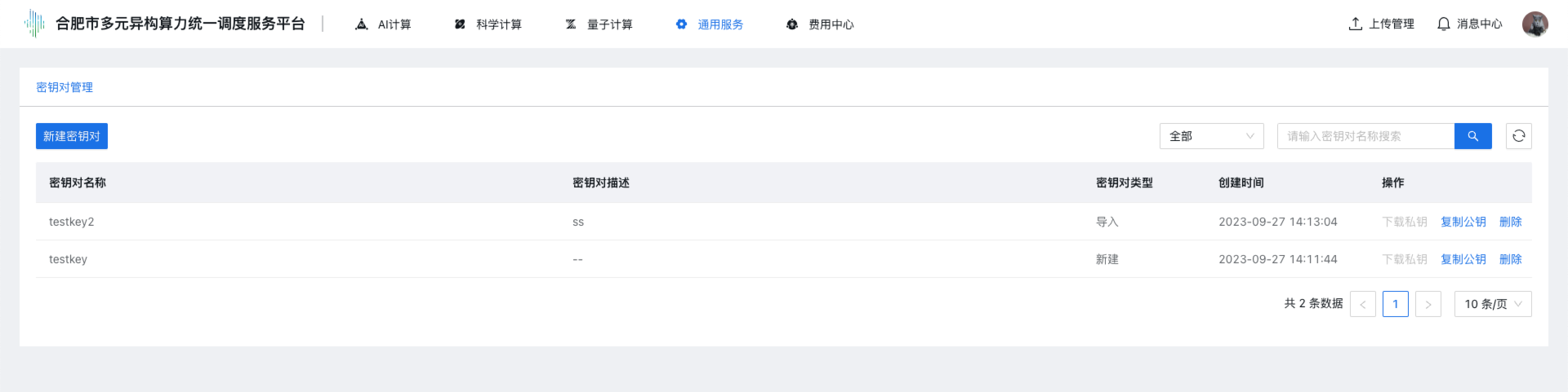 步骤2 单击上部导航栏“通用服务 → 密钥配置”,进入密钥对管理控制台,控制台展示密钥对列表,列表展示:密钥对名称、密钥对描述、密钥对类型、创建时间、操作(下载私钥、复制公钥、删除)。