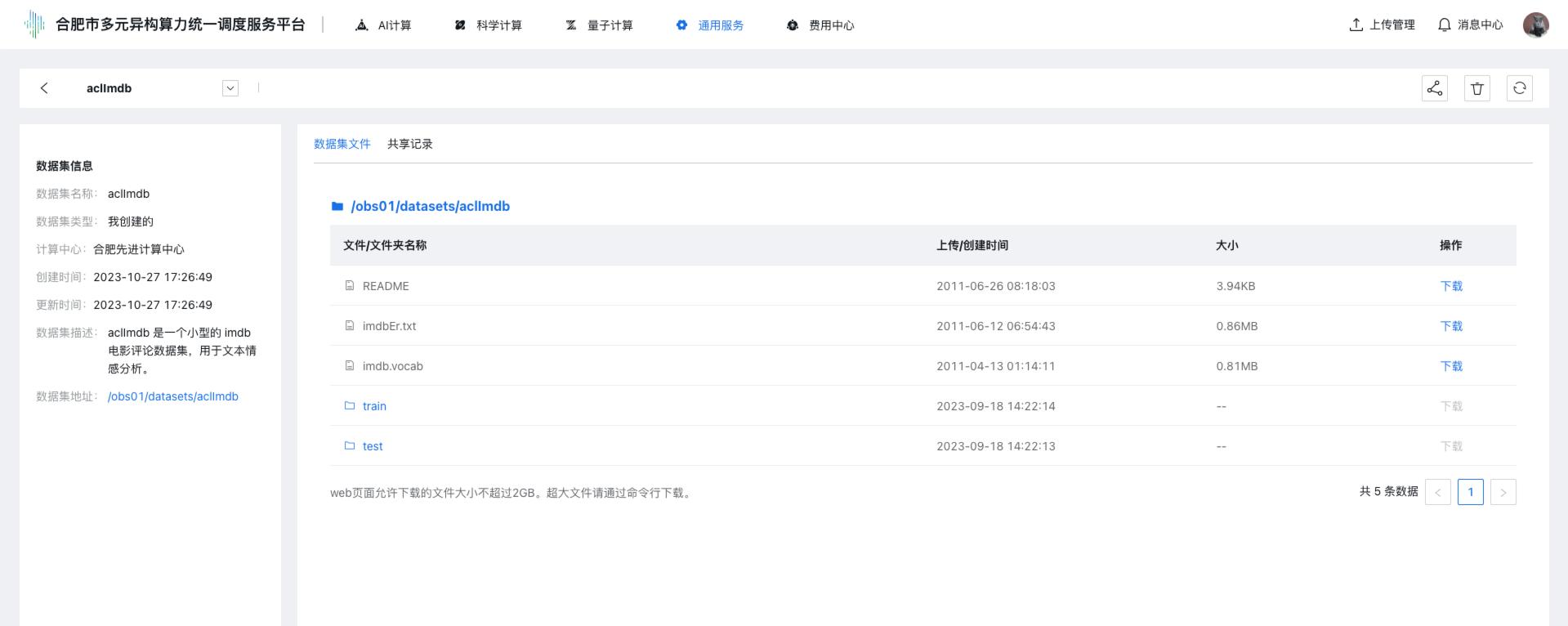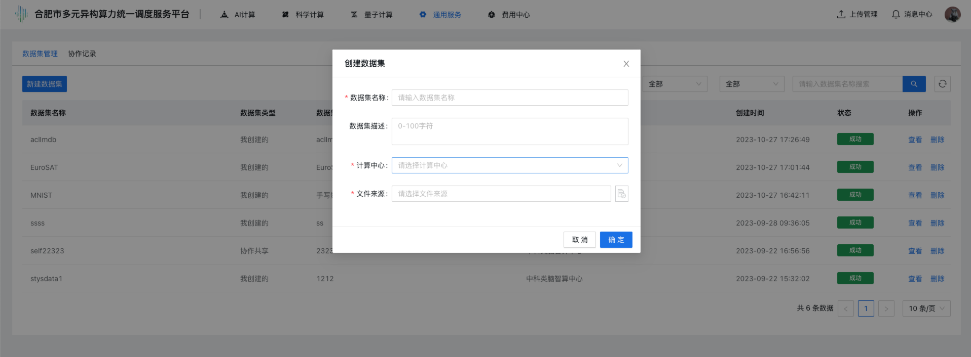 步骤2 单击上部导航栏“通用服务 → 数据集管理”,进入数据集管理控制台,控制台展示数据集列表,列表展示:数据集名称、数据集类型、数据集描述、所属计算中心、创建时间、状态、操作(查看、删除)。