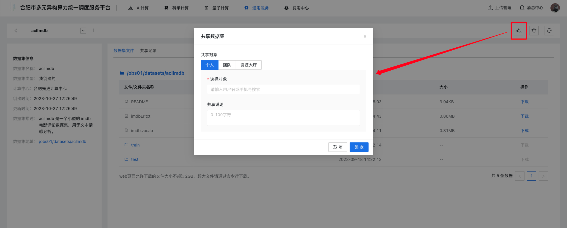 步骤7 如果是共享给个人,被共享的对象登录平台后,通过单击上部导航栏“通用服务 → 数据集管理 -> 协作记录”,能够查看到共享的数据集;如果是共享给团队,则登录平台后,通过点击右上角头像“团队管理 → 查看 → 团队数据集”,能够查看到共享的数据集;如果是共享给资源大厅,则登录平台后,通过单击上部导航栏“通用服务 → 资源大厅 → 公开数据集”,能够查看到共享的数据集。