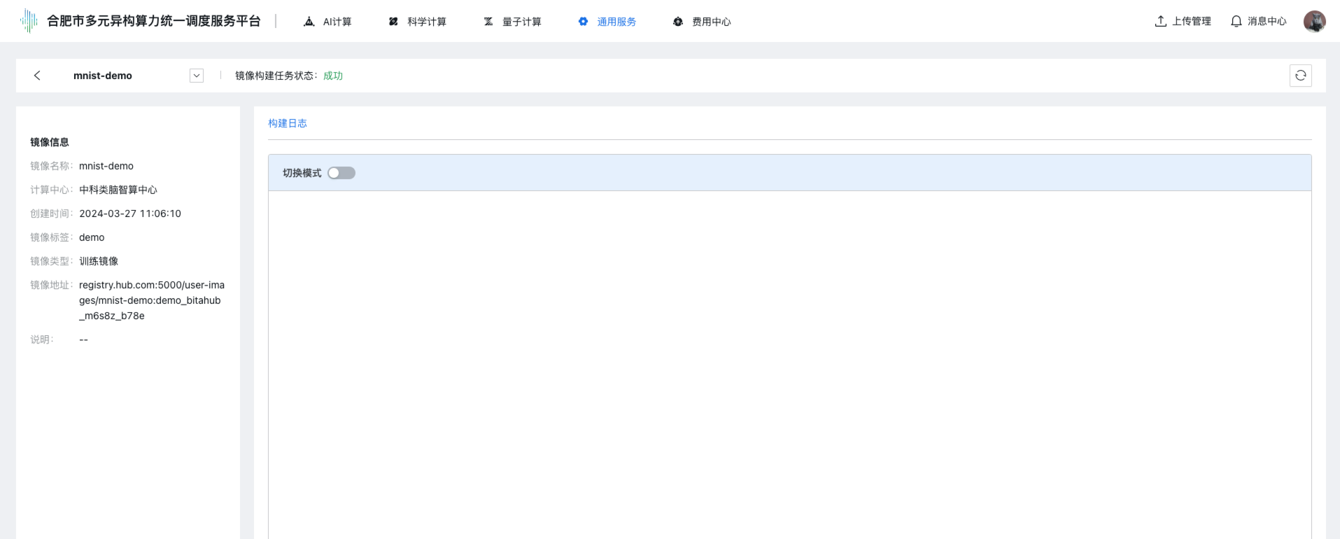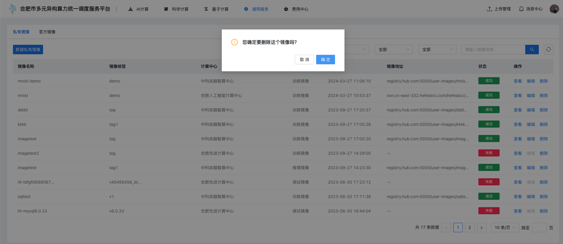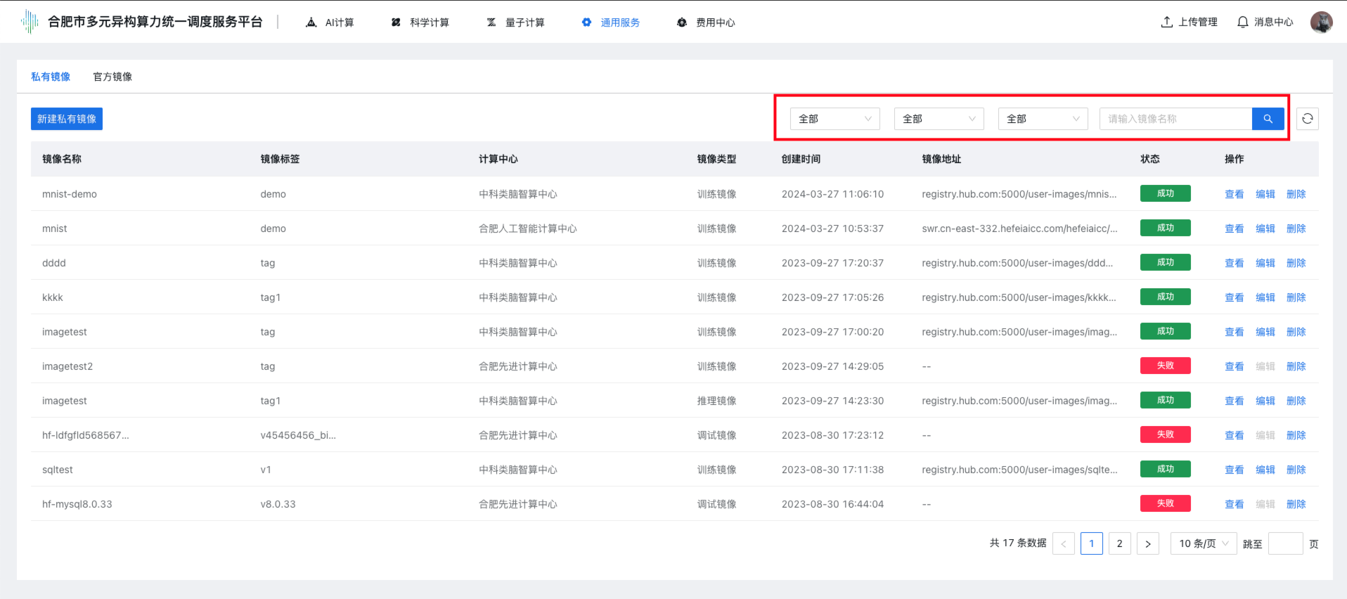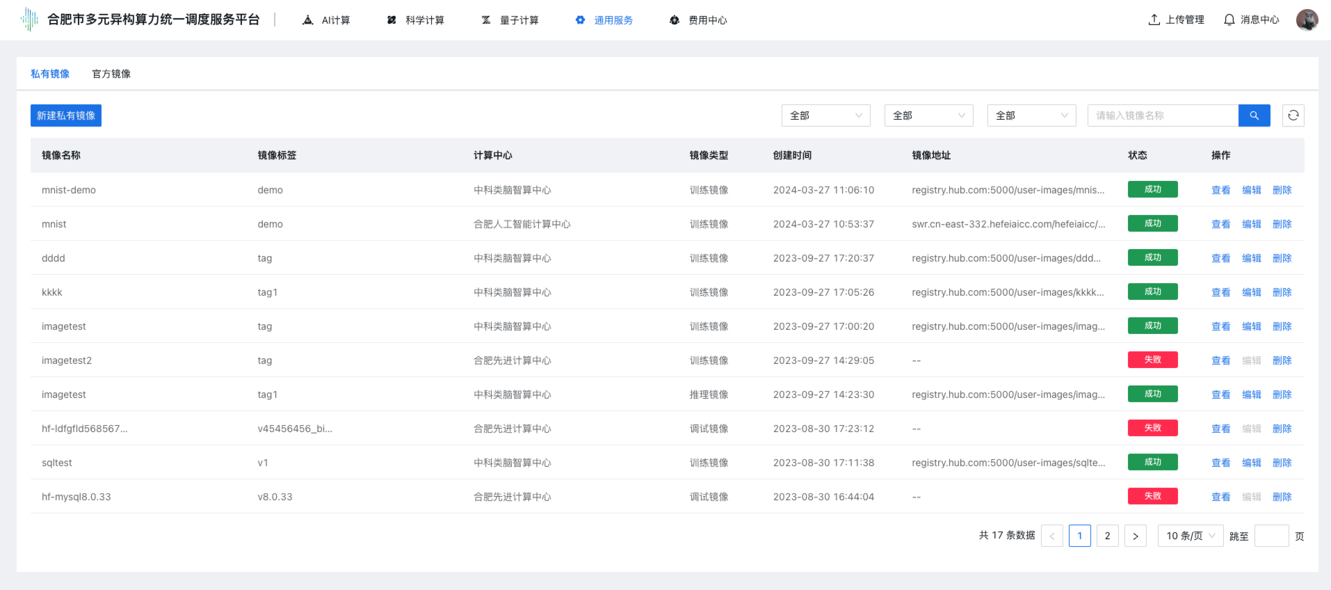 步骤2 单击上部导航栏“通用服务 → 镜像管理”,点击“私有镜像”tab标签,进入镜像管理控制台,控制台展示私有镜像列表,列表展示:镜像名称、镜像标签、计算中心、镜像类型、创建时间、镜像地址、状态、操作(查看、编辑、删除)。