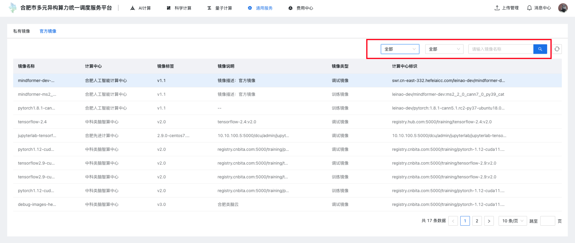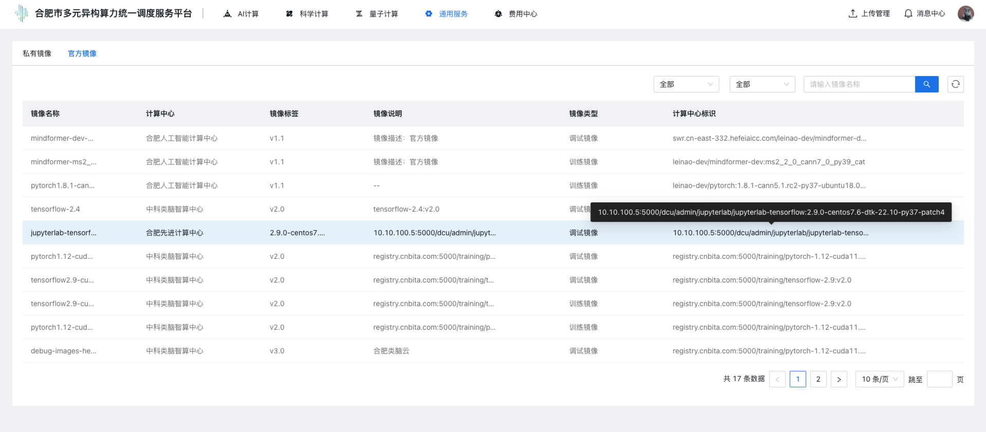 步骤2 单击上部导航栏“通用服务 → 镜像管理”,点击“官方镜像”tab标签,进入官方镜像管理控制台,控制台展示官方镜像列表,列表展示:镜像名称、计算中心、镜像标签、镜像说明、镜像类型、计算中心标识,其中计算中心标识通过鼠标悬浮可查看完整的地址信息。